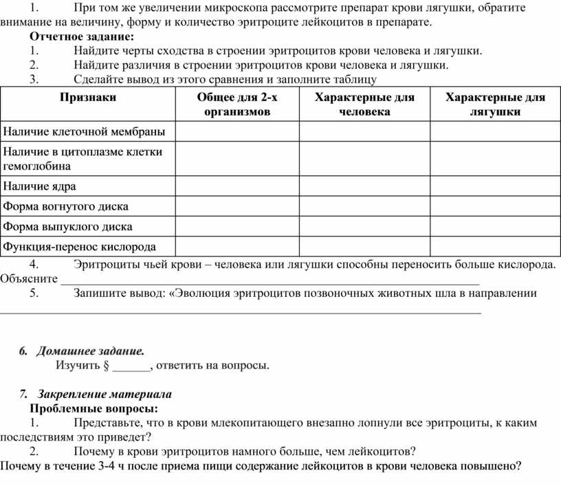 1. Найдите черты сходства в строении эритроцитов крови человека и лягушки.