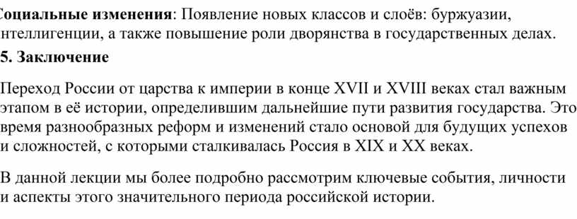 Переход России от царства к империи в конце XVII и XVIII веках стал важным этапом в её истории, определившим дальнейшие пути развития государства. Это время разнообразных реформ и изменений стало основой для будущих успехов и сложностей, с которыми сталкивалась Россия в XIX и XX веках.