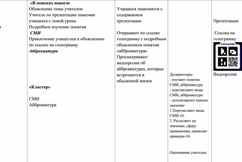 Изучают общее значение СМИ и аббревиатуры; представляют информацию в виде презентаций; составляют сложный кластер, извлекая и синтезируя информацию из текста, создают репортаж в соответствии с жанровыми особенностями; расшифровывают аббревиатуру и ставят в нужном роде; развивают навыки использования Chat GPT, проверяют полученные знания на онлайн-тесте. |