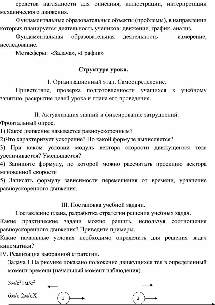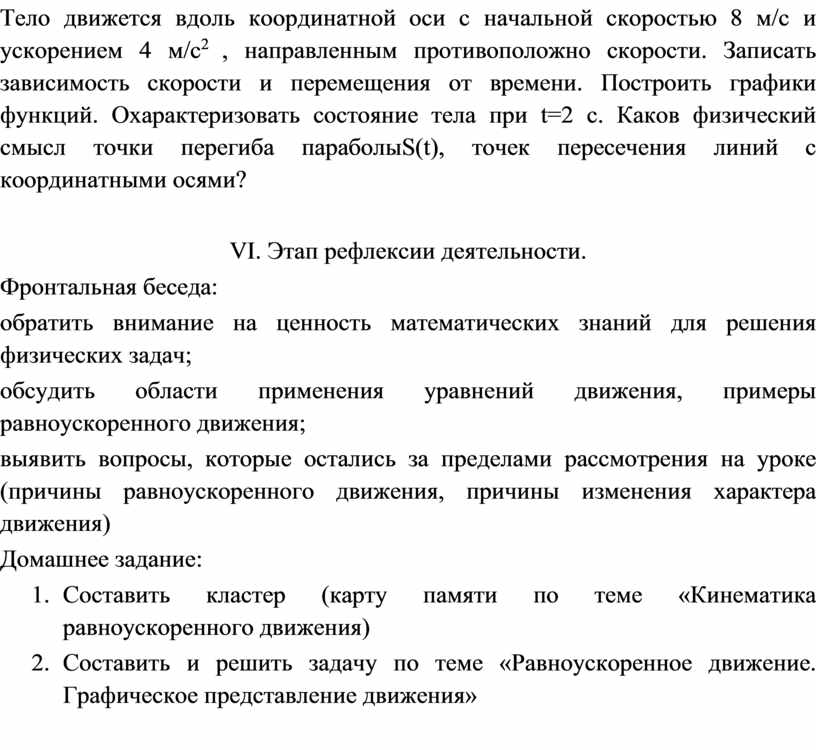 выявить вопросы, которые остались за пределами рассмотрения на уроке (причины равноускоренного движения, причины изменения характера движения)