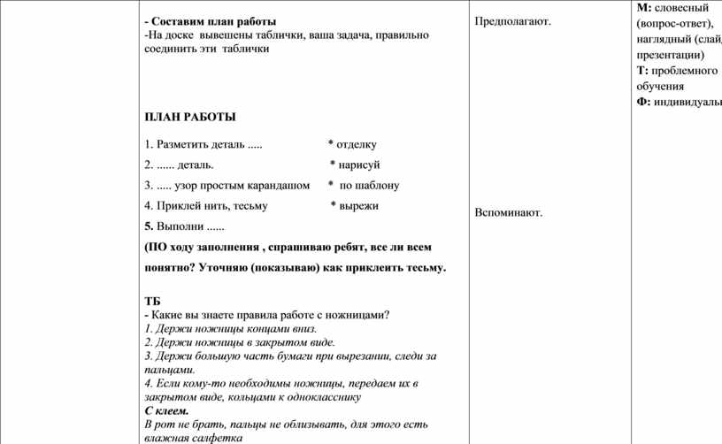 1. Разметить деталь ..... * отделку 2. ...... деталь. * нарисуй 3. ..... узор простым карандашом * по шаблону 4. Приклей нить, тесьму * вырежи 5. Выполни ...... (ПО ходу заполнения , спрашиваю ребят, все ли всем понятно? Уточняю (показываю) как приклеить тесьму.