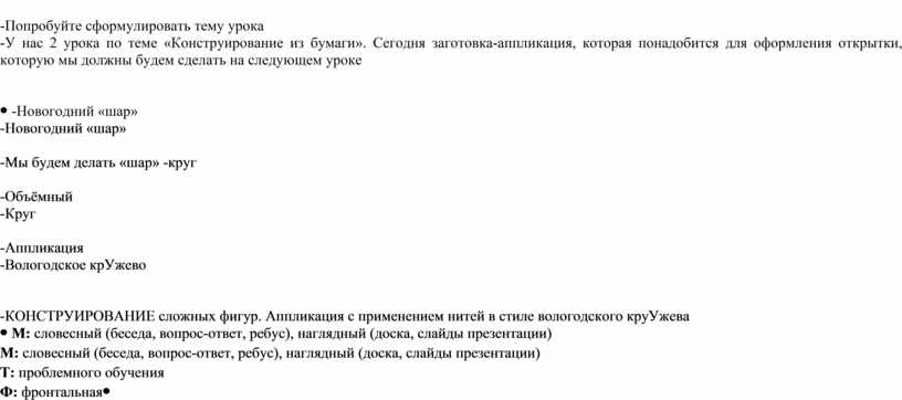 М: словесный (беседа, вопрос-ответ), наглядный (слайды презентации), наглядно-слуховой (спокойная музыка) практический (создание аппликации ,выставка) Т: развивающего обучения Ф: фронтальная, индивидуальная |