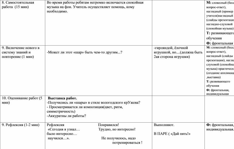 М: словесный (беседа, вопрос-ответ), наглядный (пример учителя)наглядный (слайды презентации), наглядно-слуховой (спокойная музыка) Т: развивающего обучения Ф: фронтальная |
