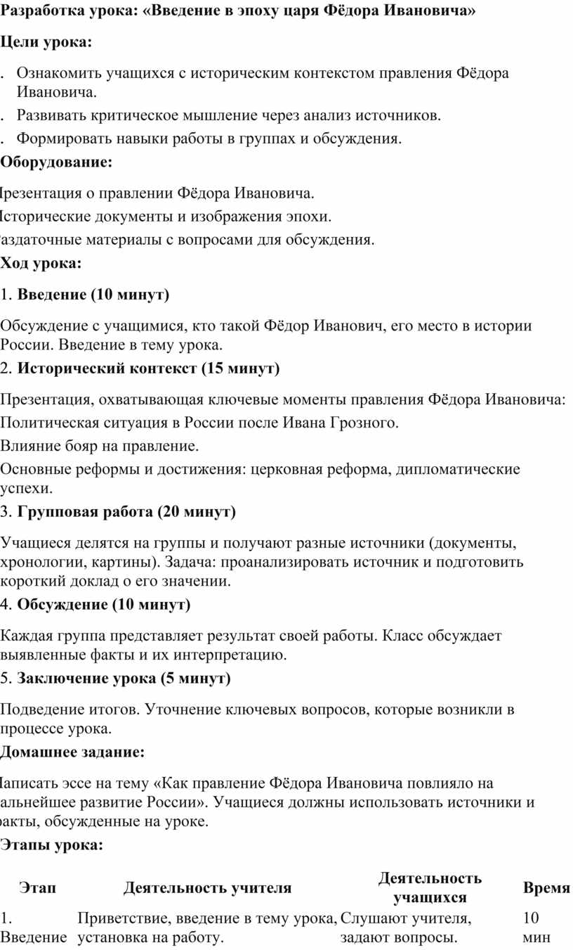 Написать эссе на тему «Как правление Фёдора Ивановича повлияло на дальнейшее развитие России». Учащиеся должны использовать источники и факты, обсужденные на уроке.