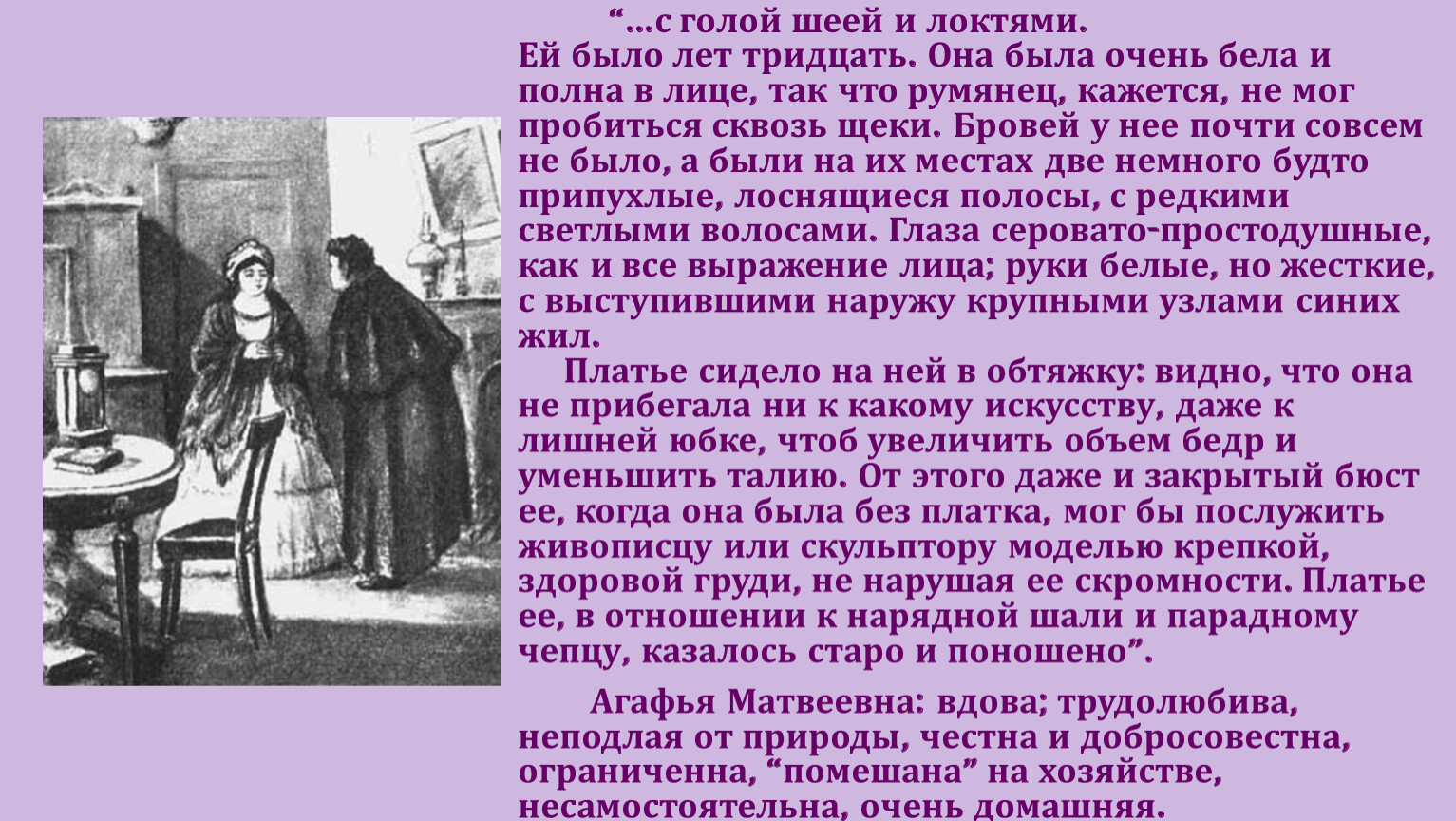 Агафья Матвеевна: вдова; трудолюбива, неподлая от природы, честна и добросовестна, ограниченна, “помешана” на хозяйстве, несамостоятельна, очень домашняя.