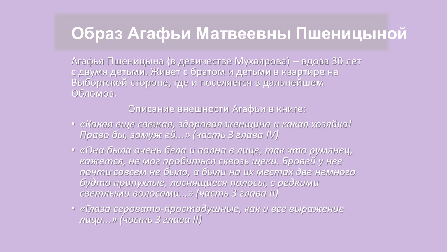 Агафья Пшеницына (в девичестве Мухоярова) – вдова 30 лет с двумя детьми. Живет с братом и детьми в квартире на Выборгской стороне, где и поселяется в дальнейшем Обломов.