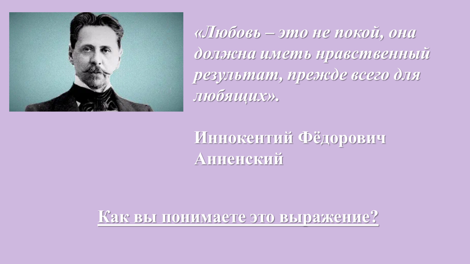 «Любовь – это не покой, она должна иметь нравственный результат, прежде всего для любящих».