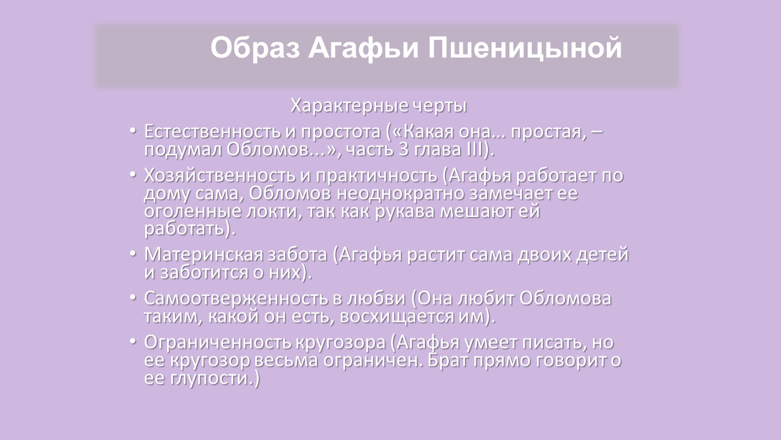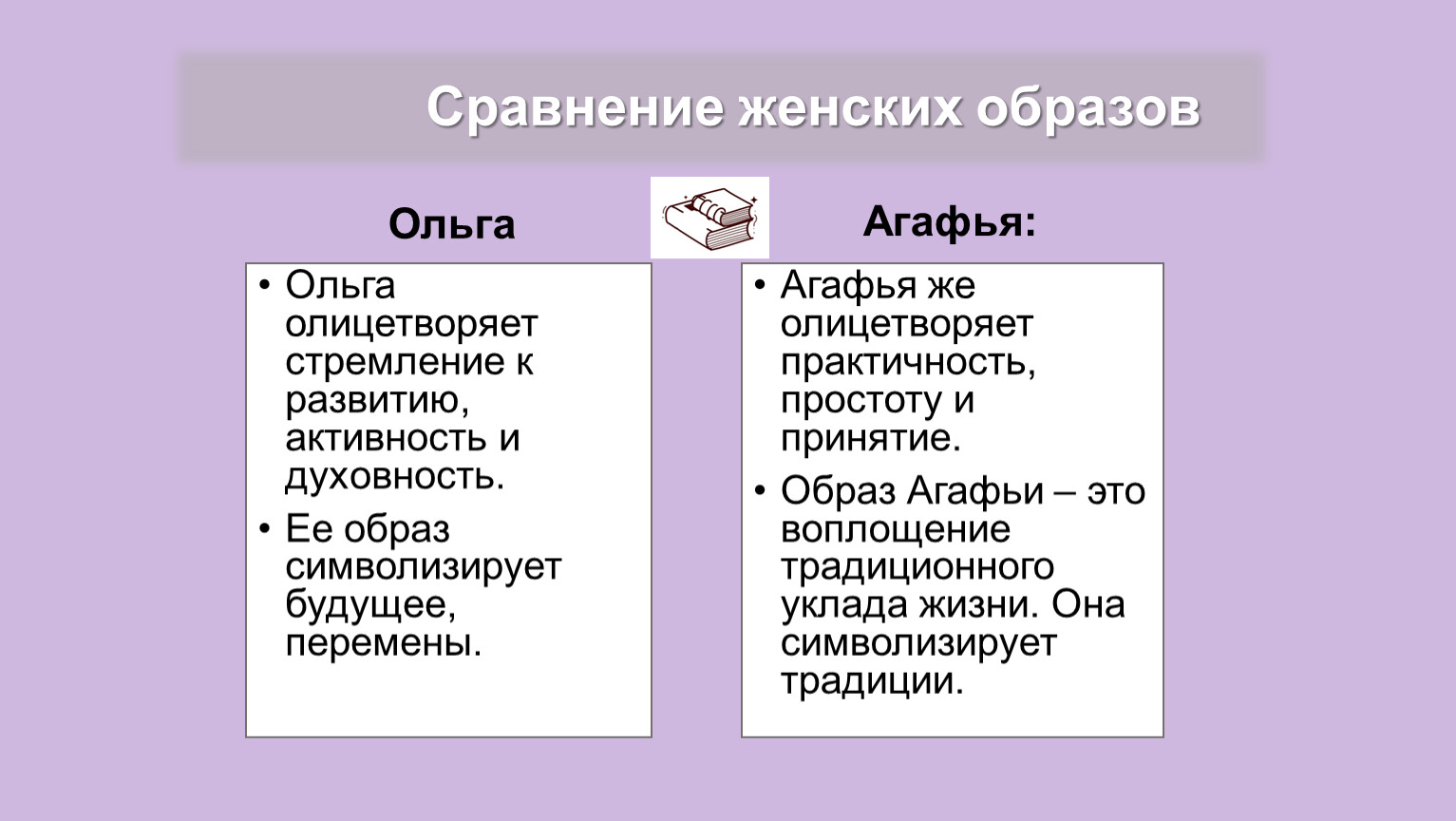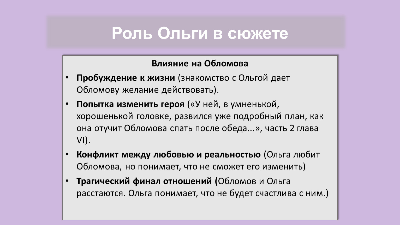 Понимание влияния женского характера на судьбу героя. Ольга ненадолго изменила Обломова, но он предпочел привычную ему жизнь, не подверженную изменениям. Агафья вернула ему ту жизнь, которой он жил в детстве.