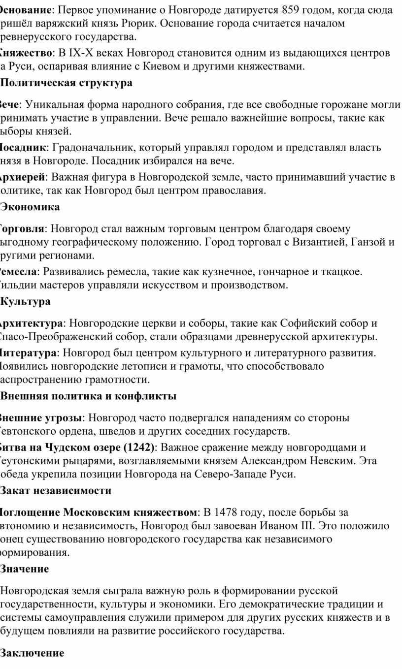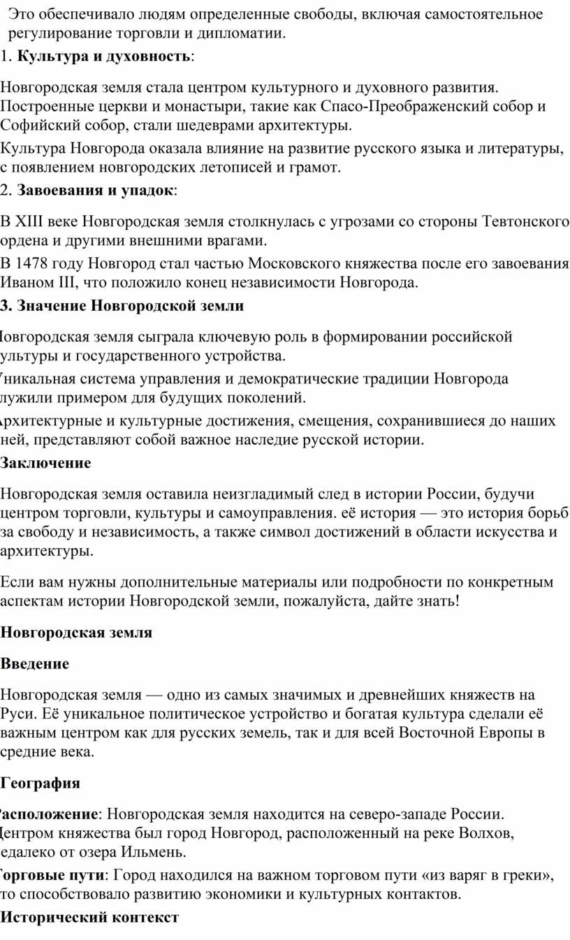 Если вам нужны дополнительные материалы или подробности по конкретным аспектам истории Новгородской земли, пожалуйста, дайте знать!