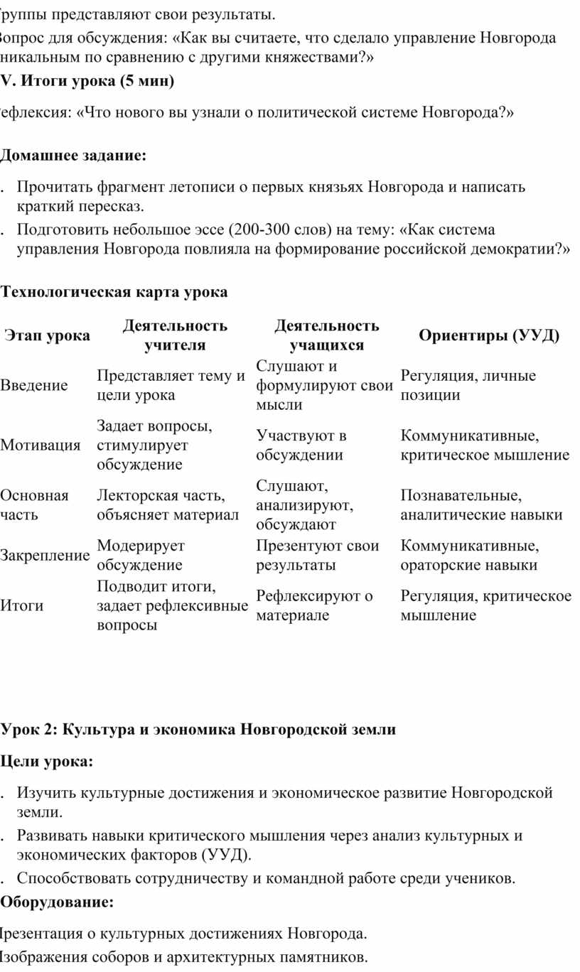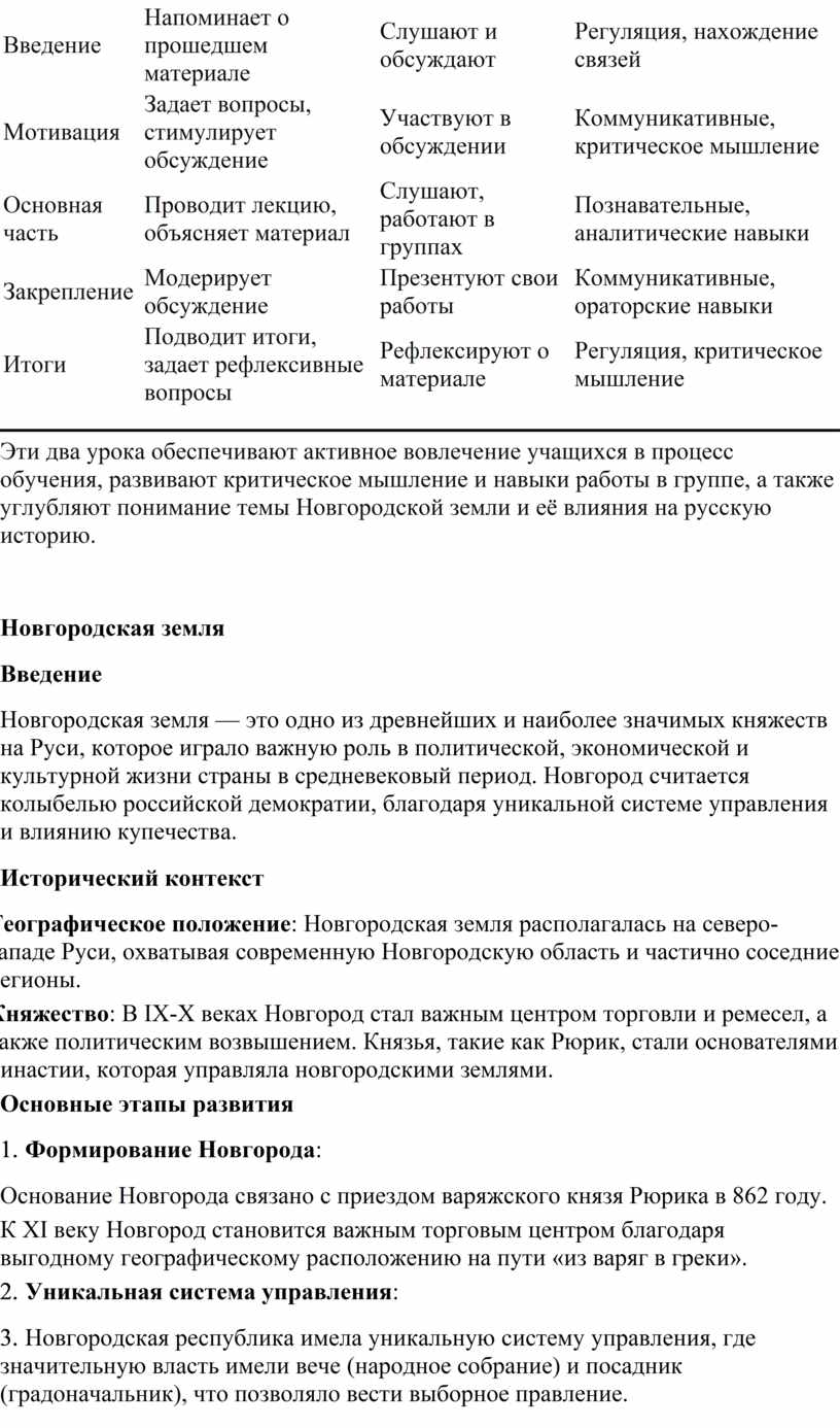 Эти два урока обеспечивают активное вовлечение учащихся в процесс обучения, развивают критическое мышление и навыки работы в группе, а также углубляют понимание темы Новгородской земли и её влияния на русскую историю.