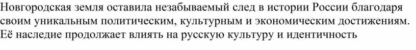 Новгородская земля оставила незабываемый след в истории России благодаря своим уникальным политическим, культурным и экономическим достижениям. Её наследие продолжает влиять на русскую культуру и идентичность