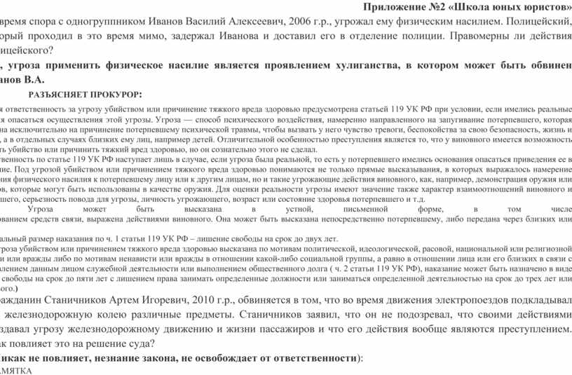 1. Во время спора с одногруппником Иванов Василий Алексеевич, 2006 г.р., угрожал ему физическим насилием. Полицейский, который проходил в это время мимо, задержал Иванова и доставил его в отделение полиции. Правомерны ли действия полицейского?