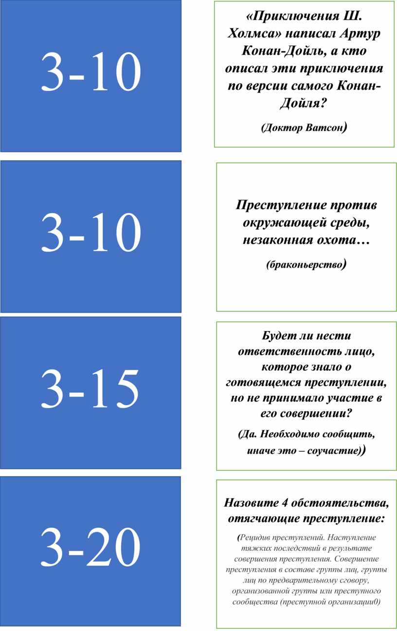 На обговаривание задания – 1 минута. Отвечает первой та команда, которая первой подняла сигнальную карточку. Правильный ответ приносит команде 20 баллов, если ответ неверный – право дать ответ переходит к соперникам, которые в случае правильного ответа могут заработать – 10 баллов.