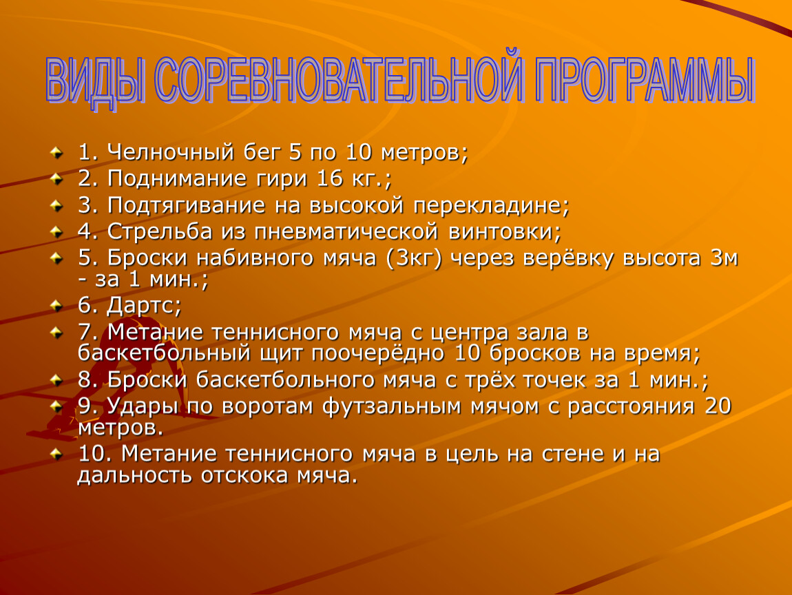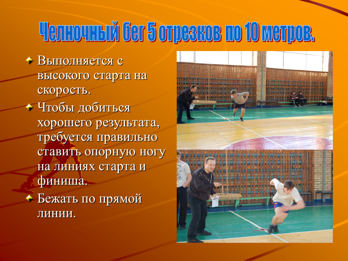 1. Челночный бег 5 по 10 метров;