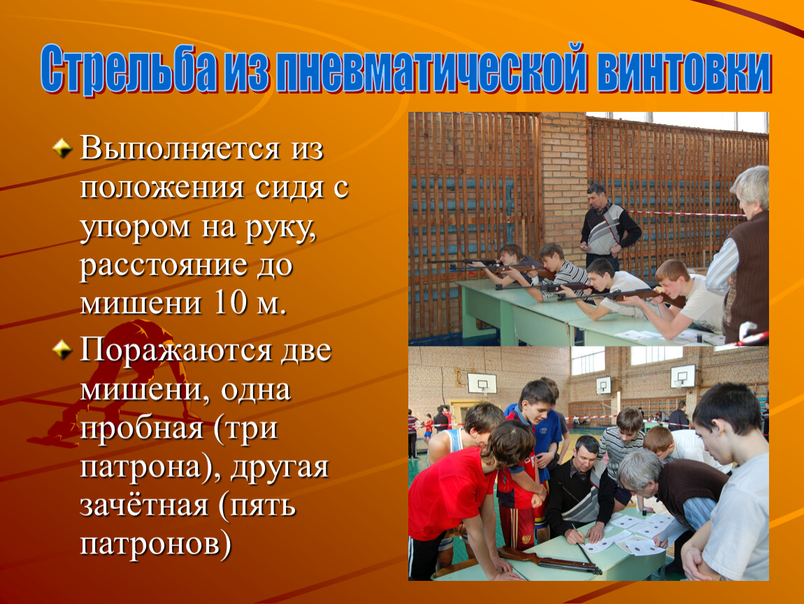 Выполняется из положения сидя с упором на руку, расстояние до мишени 10 м.