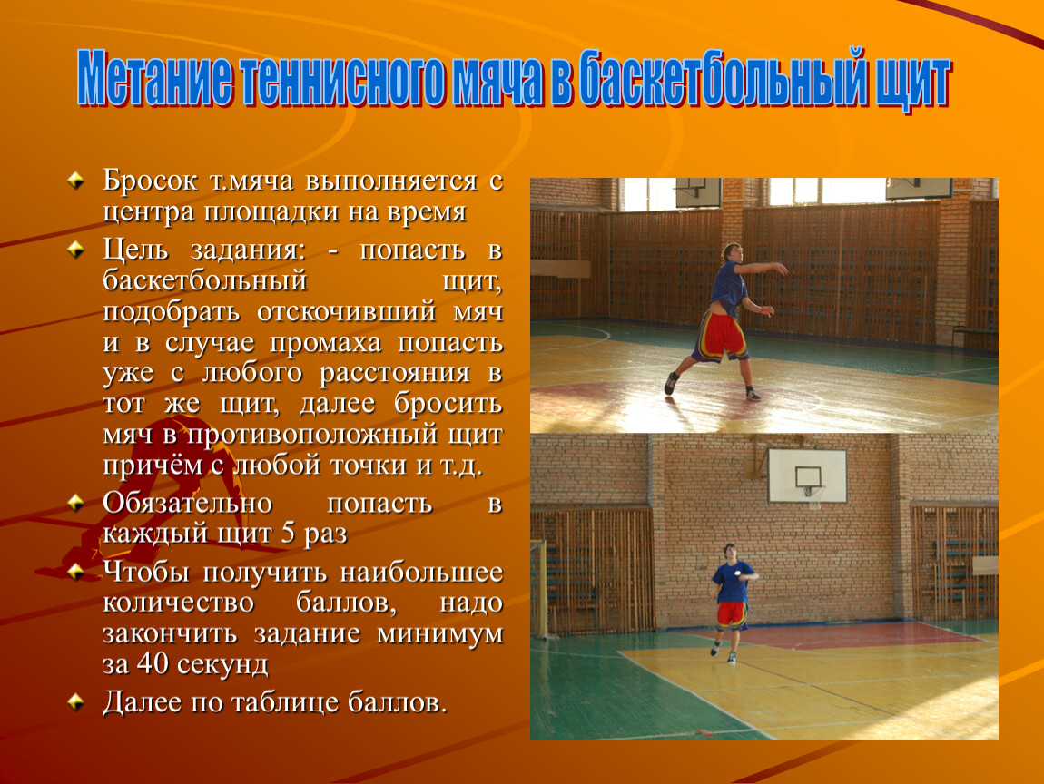 7. Метание теннисного мяча с центра зала в баскетбольный щит поочерёдно 10 бросков на время;