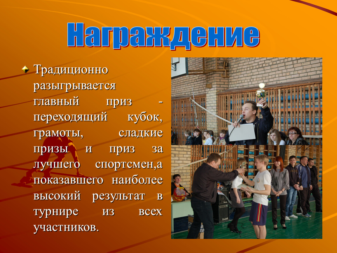 Традиционно разыгрывается главный приз - переходящий кубок, грамоты, сладкие призы и приз за лучшего спортсмен,а показавшего наиболее высокий результат в турнире из всех участников.