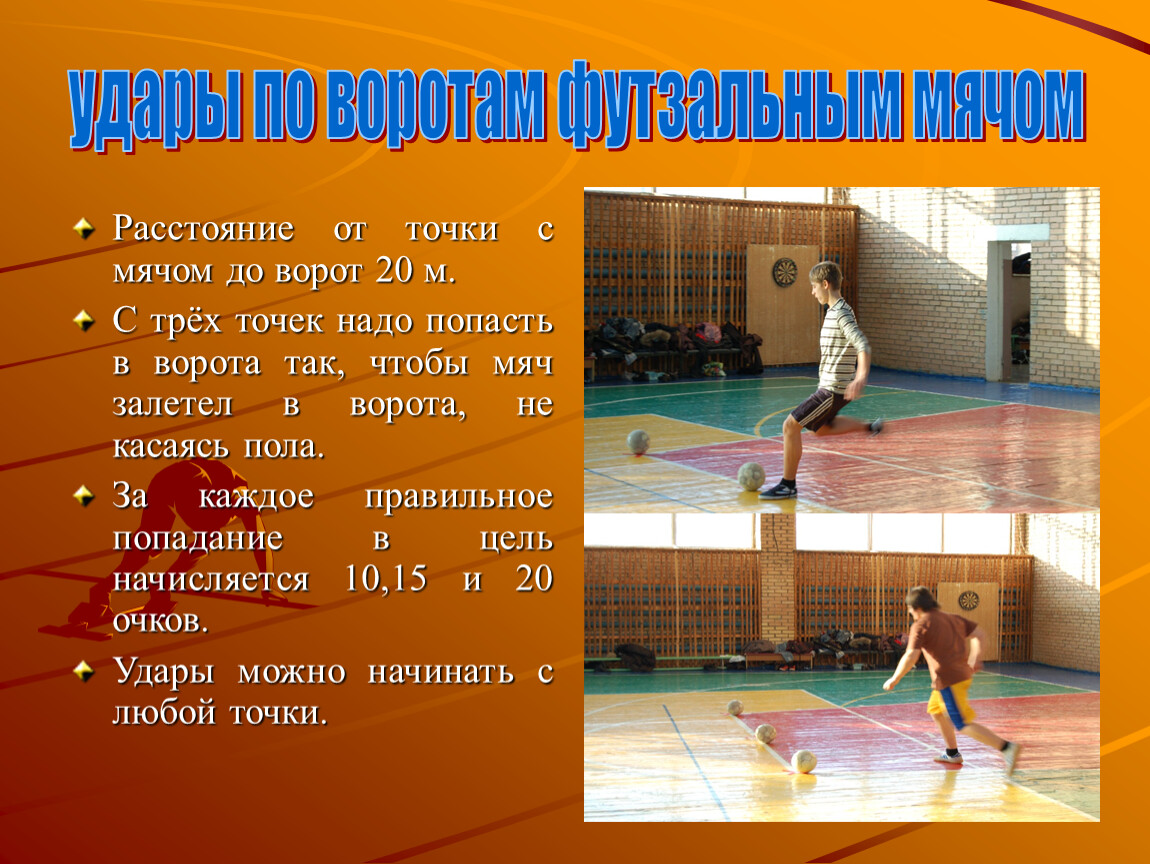 9. Удары по воротам футзальным мячом с расстояния 20 метров.