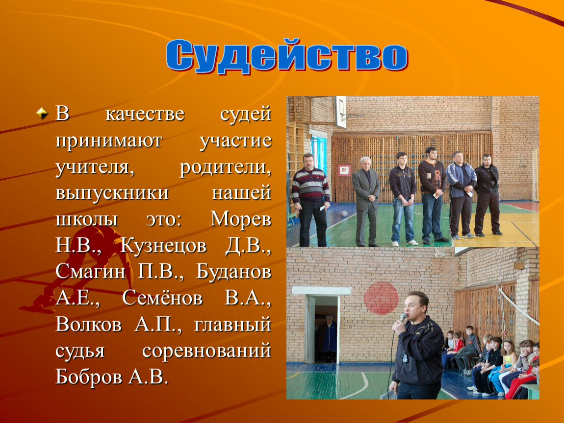 В качестве судей принимают участие учителя, родители, выпускники нашей школы это: Морев Н.В., Кузнецов Д.В., Смагин П.В., Буданов А.Е., Семёнов В.А., Волков А.П., главный судья соревнований Бобров А.В.