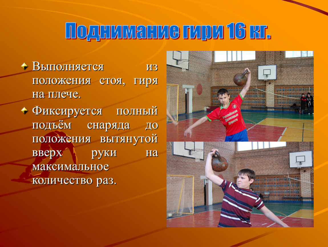 2. Поднимание гири 16 кг.;