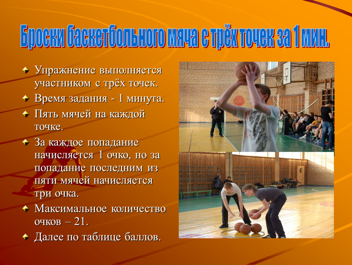 Броски баскетбольного мяча с трёх точек за 1 мин.
