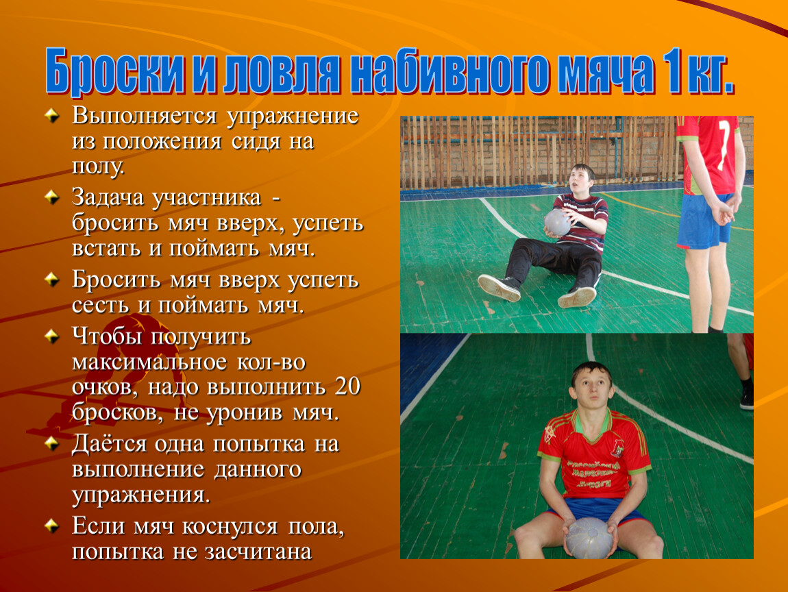 Задача участника - бросить мяч вверх, успеть встать и поймать мяч.