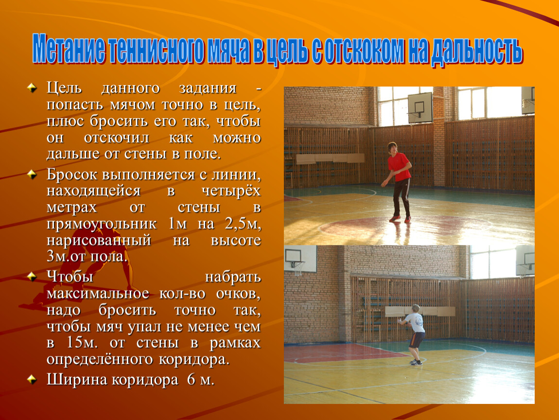Цель данного задания - попасть мячом точно в цель, плюс бросить его так, чтобы он отскочил как можно дальше от стены в поле.