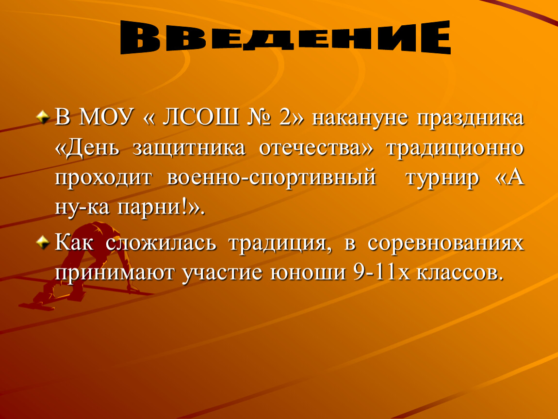 Как сложилась традиция, в соревнованиях принимают участие юноши 9-11х классов.