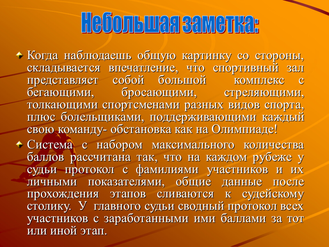 Система с набором максимального количества баллов рассчитана так, что на каждом рубеже у судьи протокол с фамилиями участников и их личными показателями, общие данные после прохождения этапов сливаются к судейскому столику. У главного судьи сводный протокол всех участников с заработанными ими баллами за тот или иной этап.