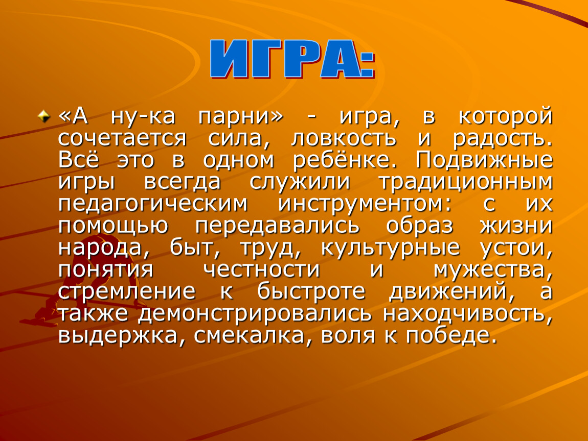 «А ну-ка парни» - игра, в которой сочетается сила, ловкость и радость. Всё это в одном ребёнке. Подвижные игры всегда служили традиционным педагогическим инструментом: с их помощью передавались образ жизни народа, быт, труд, культурные устои, понятия честности и мужества, стремление к быстроте движений, а также демонстрировались находчивость, выдержка, смекалка, воля к победе.