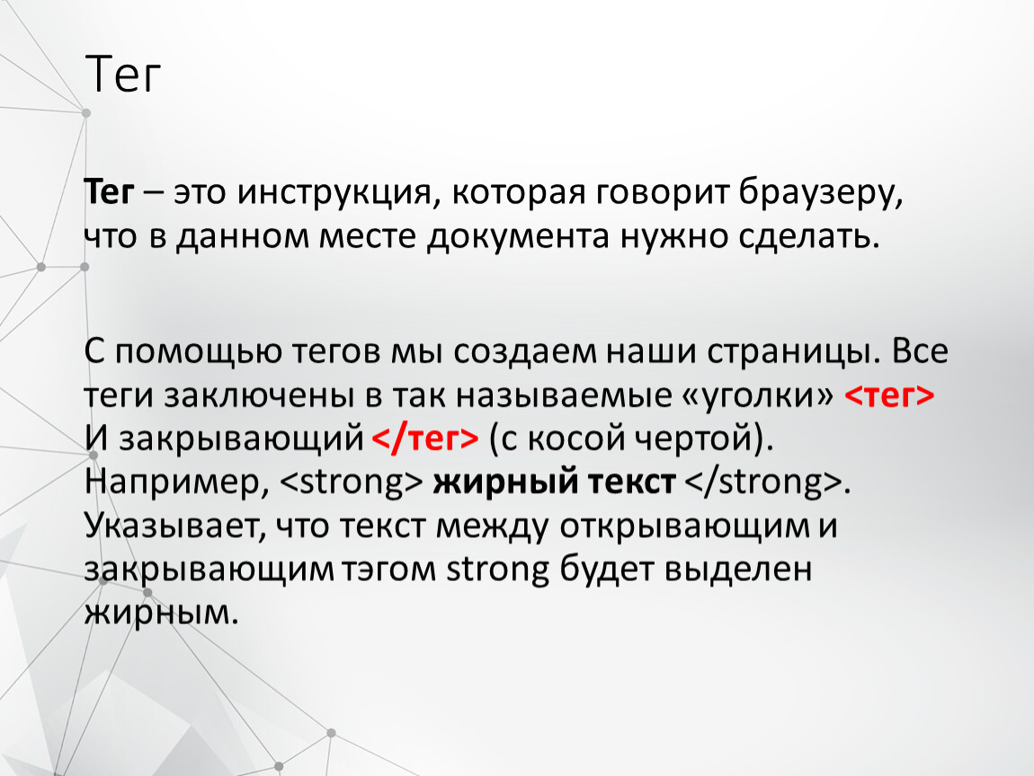 Тег – это инструкция, которая говорит браузеру, что в данном месте документа нужно сделать.