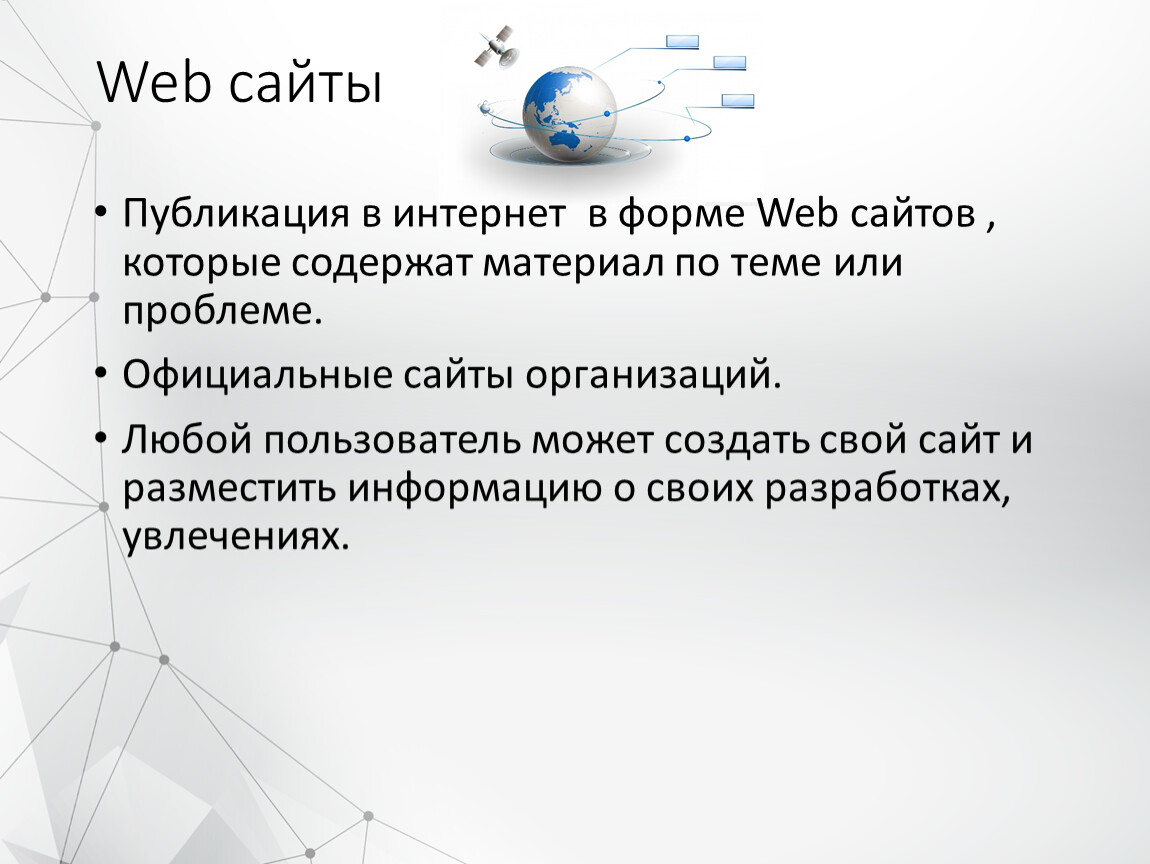Публикация в интернет в форме Web сайтов , которые содержат материал по теме или проблеме.