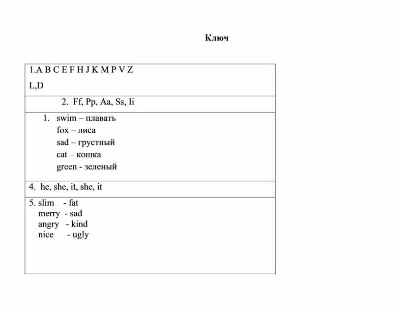 1. swim – плавать fox – лиса sad – грустный cat – кошка green - зеленый |