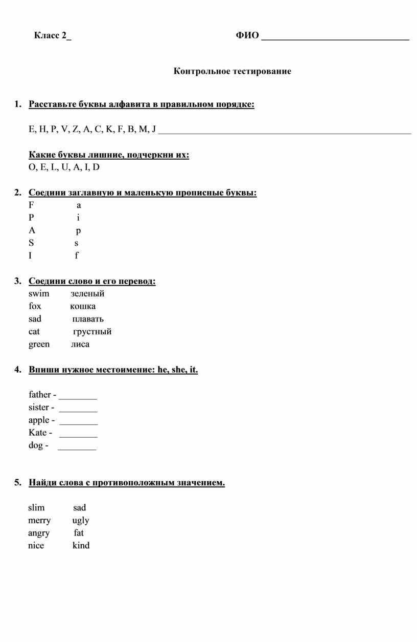 Работа состоит из 5 заданий. Задания содержат следующую тематику: алфавит, знание лексики за 2 класс. Всего можно получить 21 балл, по одному баллу за каждый правильный ответ.