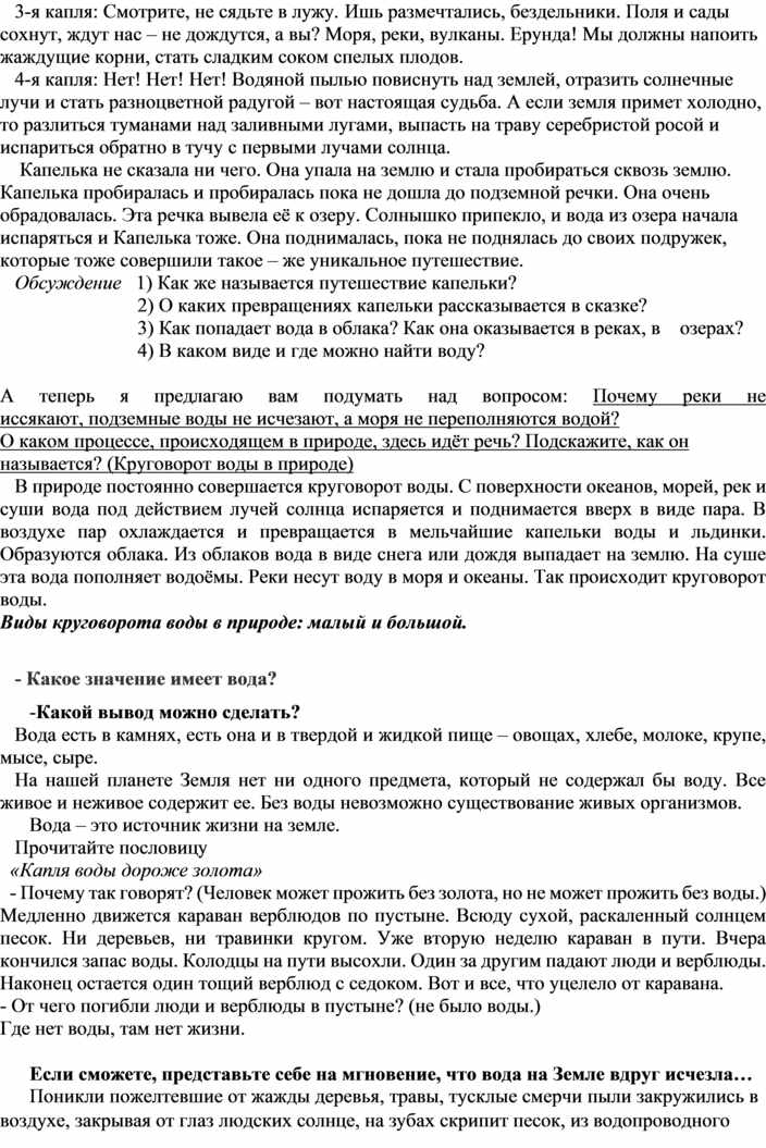 1-я капля: Как только приземлюсь, сразу же найду ручей. Вместе с ним побегу к реке. Вместе с рекой отправлюсь в море. И буду гулять на просторе с морской водой, а надоест – опять испарюсь в тучку. Как это грустно звучит – капля в море…