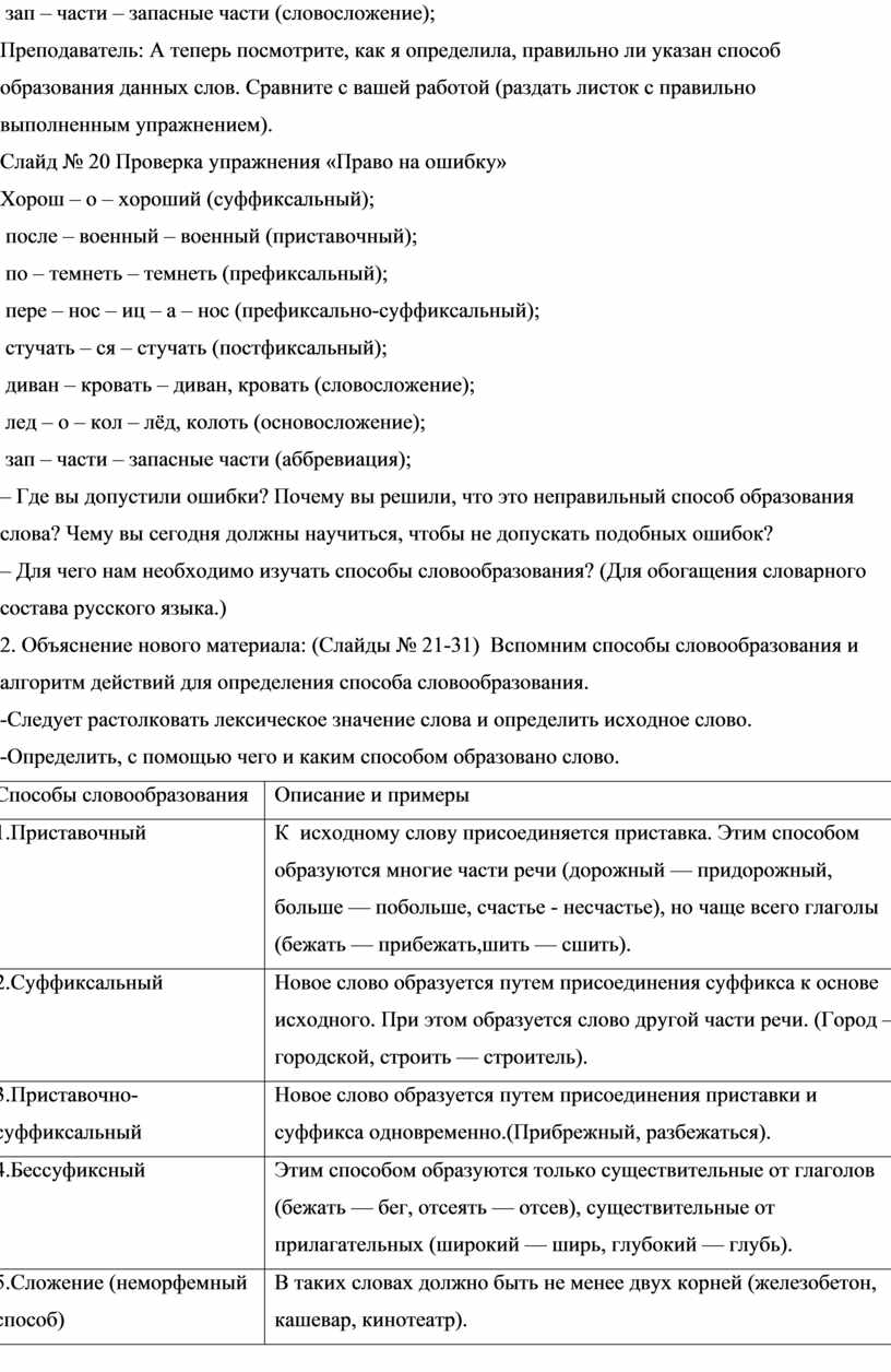 Преподаватель: А теперь посмотрите, как я определила, правильно ли указан способ образования данных слов. Сравните с вашей работой (раздать листок с правильно выполненным упражнением).