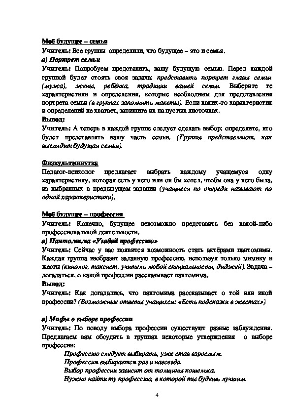 Учитель: Попробуем представить, вашу будущую семью. Перед каждой