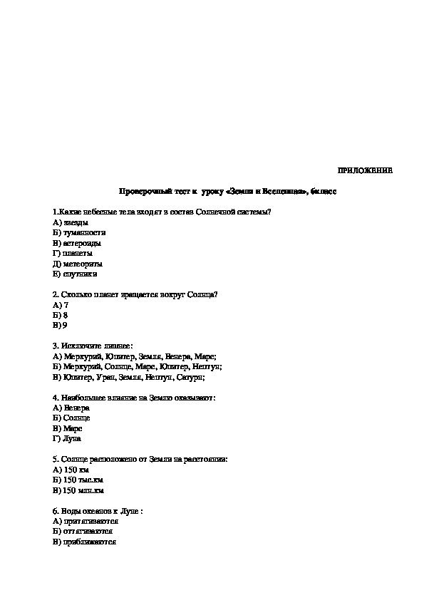 Итого:Проверочный тест к уроку «Земля и Вселенная», 6класс