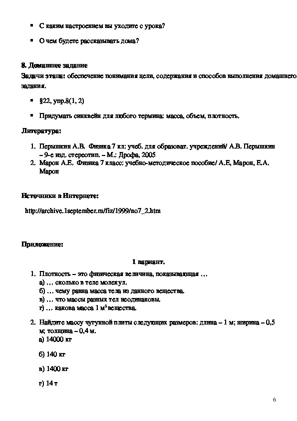 1. Перышкин А.В. Физика 7 кл: учеб. для образоват. учреждений/ А.В. Перышкин