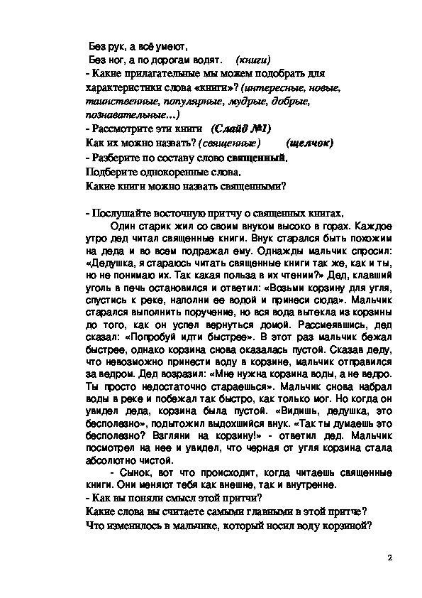 Один старик жил со своим внуком высоко в горах. Каждое утро дед читал священные книги. Внук старался быть похожим на деда и во всем подражал ему. Однажды мальчик спросил: «Дедушка, я стараюсь читать священные книги так же, как и ты, но не понимаю их. Так какая польза в их чтении?» Дед, клавший уголь в печь остановился и ответил: «Возьми корзину для угля, спустись к реке, наполни ее водой и принеси сюда». Мальчик старался выполнить поручение, но вся вода вытекла из корзины до того, как он успел вернуться домой. Рассмеявшись, дед сказал: «Попробуй идти быстрее». В этот раз мальчик бежал быстрее, однако корзина снова оказалась пустой. Сказав деду, что невозможно принести воду в корзине, мальчик отправился за ведром. Дед возразил: «Мне нужна корзина воды, а не ведро. Ты просто недостаточно стараешься». Мальчик снова набрал воды в реке и побежал так быстро, как только мог. Но когда он увидел деда, корзина была пустой. «Видишь, дедушка, это бесполезно», подытожил выдохшийся внук. «Так ты думаешь это бесполезно? Взгляни на корзину!» - ответил дед. Мальчик посмотрел на нее и увидел, что черная от угля корзина стала абсолютно чистой.конспект