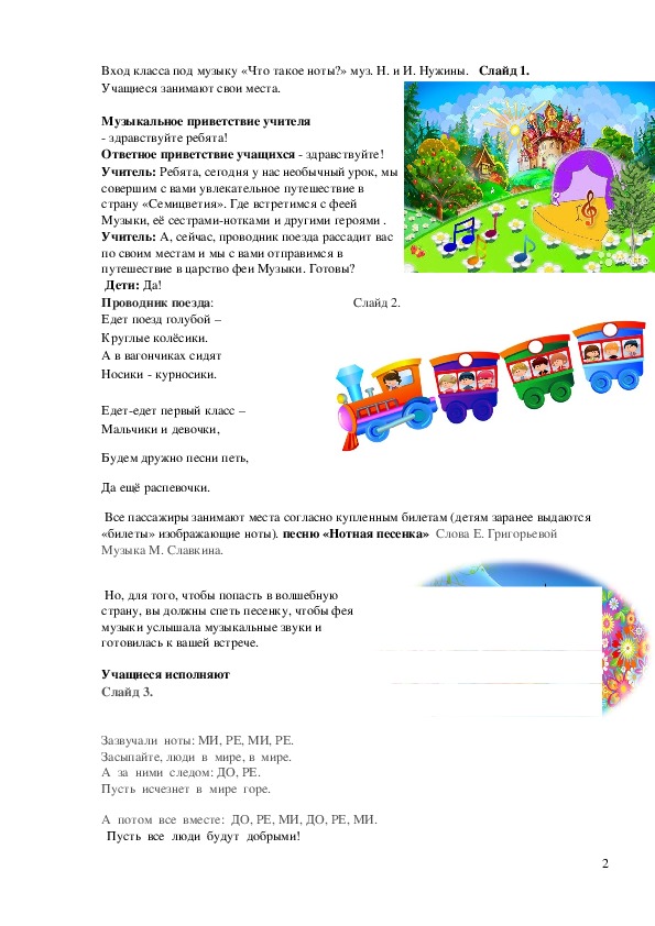 1Вход класса под музыку «Что такое ноты?» муз. Н. и И. Нужины. Слайд 1.