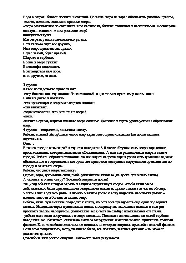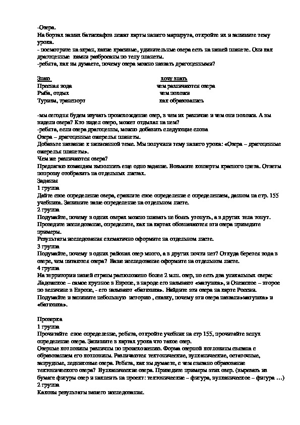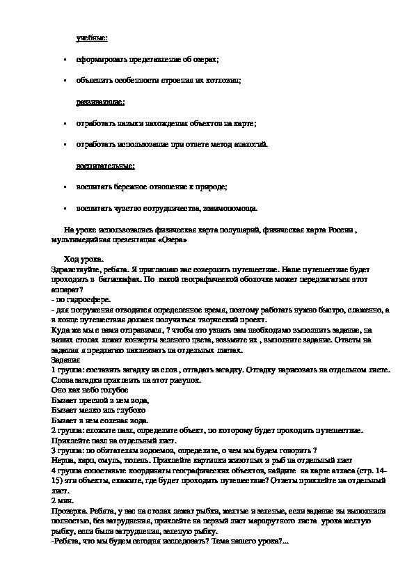 Цель урока: формирование представлений об озерах, их особенностях, типах озерных котловин, областей распространения и влияния озер на жизнь людей.