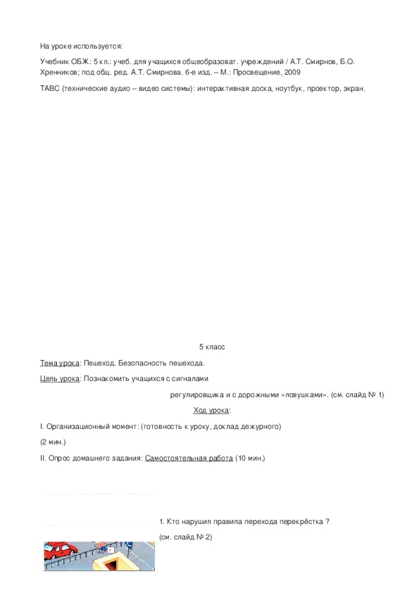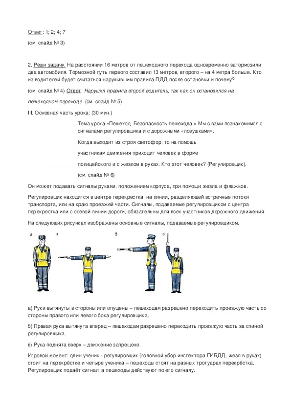 регулировщика и с дорожными «ловушками». (см. слайд № 1) На расстоянии 16 метров от пешеходного перехода одновременно затормозили два автомобиля. Тормозной путь первого составил 13 метров, второго – на 4 метра больше. Кто из водителей будет считаться нарушившим правила ПДД после остановки и почему?конспект