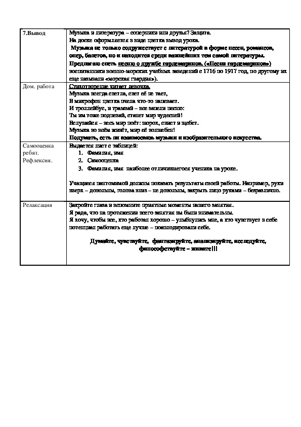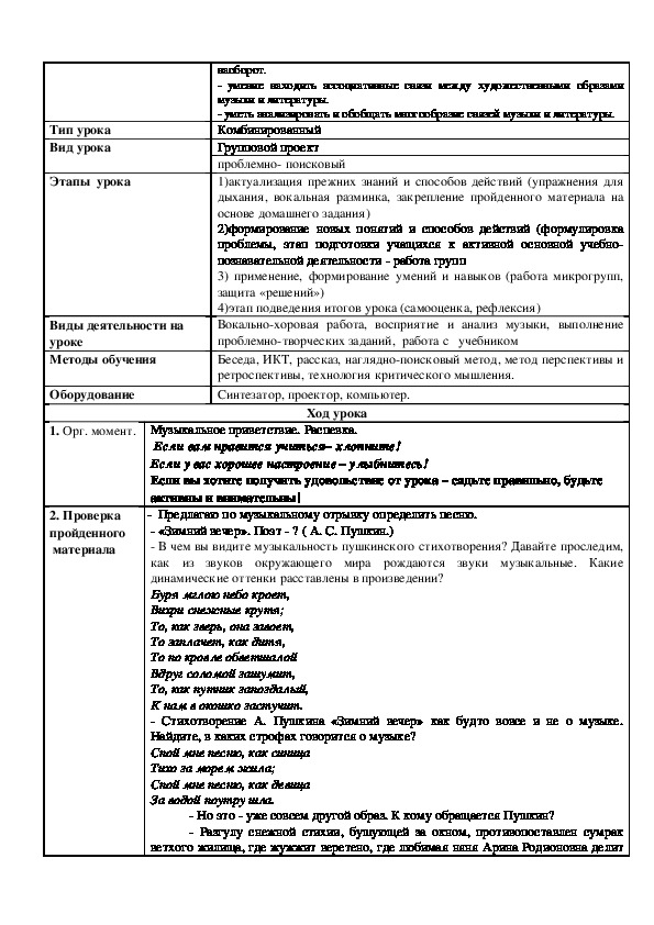 Представлена технологическая карта урока в соответствии с требованиями федерального образовательного стандарта. Идея урока - через практическую и исследовательскую деятельность выяснить о содружестве музыки и литературы. В ходе урока обучающиеся исследуют значение музыки для воплощения литературных образов и наоборот, находить ассоциативные связи между художественными образами музыки и литературы, учатся анализировать и обобщать многообразие связей музыки и литературы.