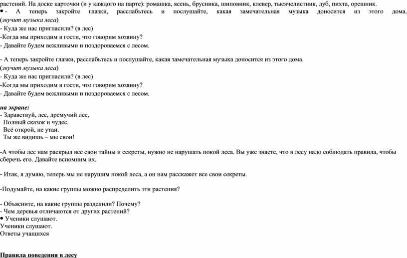 Вспомнить правила поведения в лесу, этажи леса и отличие деревьев от других растений. На доске карточки (и у каждого на парте): ромашка, ясень, брусника, шиповник, клевер, тысячелистник, дуб, пихта, орешник.