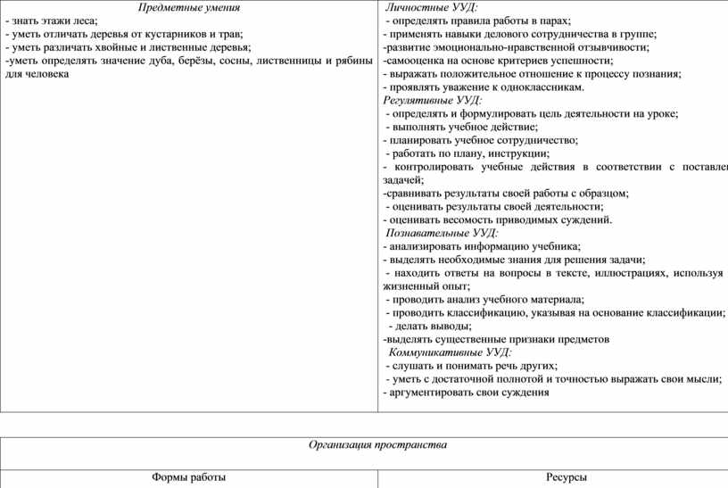 Предметные умения - знать этажи леса; - уметь отличать деревья от кустарников и трав; - уметь различать хвойные и лиственные деревья; -уметь определять значение дуба, берёзы, сосны, лиственницы и рябины для человека