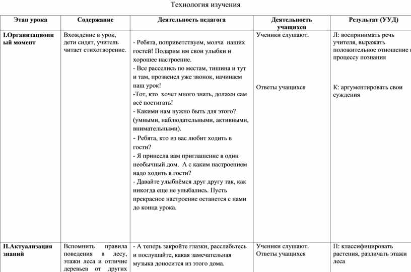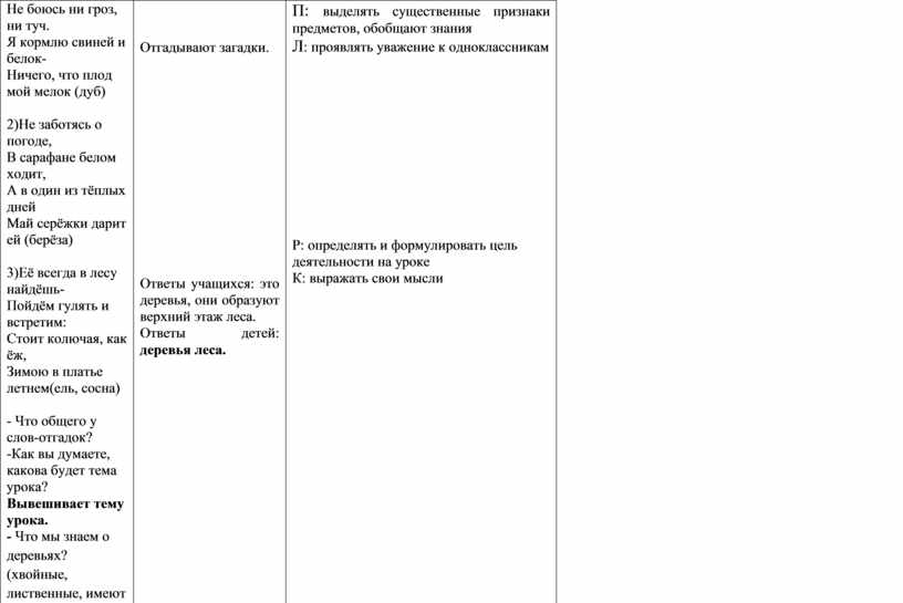 П: классифицировать растения, различать этажи леса К: умение выражать свои мысли Р: выполнять учебное действие, контролировать свои действия |