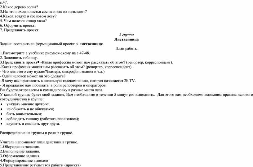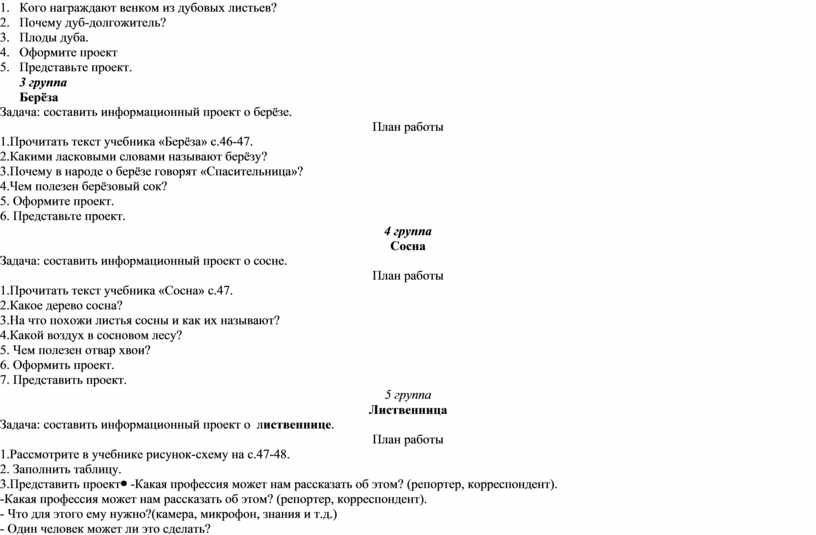 Работа в группах по проектам. 1 группа Рябина Задача: составить информационный проект о рябине. План работы 1. Прочитать текст карточки. 2. Определить виды деревьев. 3. Заполнить таблицу. 4. Представление проекта (таблицы) 2 группа Дуб Задача: составить информационный проект о дубе. План работы 1. Прочитать текст учебника «Дуб» стр. 45. 2. Какими словами говорят про дуб? 3. Что означает дубовая ветвь? 4. Кого награждают венком из дубовых листьев? 5. Почему дуб-долгожитель? 6. Плоды дуба. 7. Оформите проект 8. Представьте проект. 3 группа Берёза Задача: составить информационный проект о берёзе. План работы 1.Прочитать текст учебника «Берёза» с.46-47. 2.Какими ласковыми словами называют берёзу? 3.Почему в народе о берёзе говорят «Спасительница»? 4.Чем полезен берёзовый сок? 5. Оформите проект. 6. Представьте проект. 4 группа Сосна Задача: составить информационный проект о сосне. План работы 1.Прочитать текст учебника «Сосна» с.47. 2.Какое дерево сосна? 3.На что похожи листья сосны и как их называют? 4.Какой воздух в сосновом лесу? 5. Чем полезен отвар хвои? 6. Оформить проект. 7. Представить проект. 5 группа Лиственница Задача: составить информационный проект о лиственнице. План работы 1.Рассмотрите в учебнике рисунок-схему на с.47-48. 2. Заполнить таблицу. 3.Представить проект |