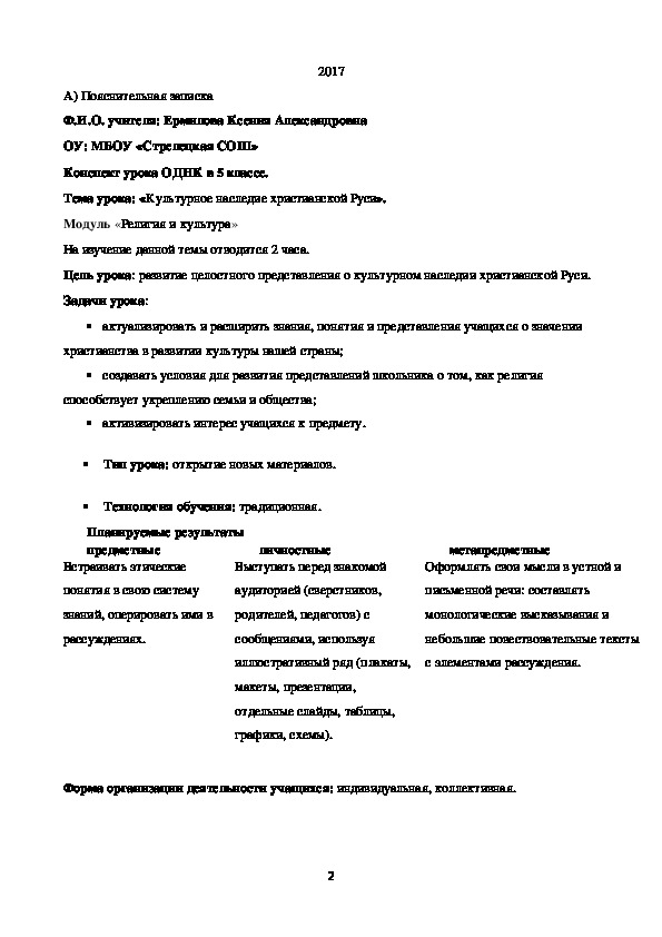 Цель урока: развитие целостного представления о культурном наследии христианской