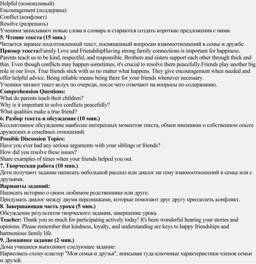 Пример текста:Family Love and FriendshipHaving strong family connections is important for happiness. Parents teach us to be kind, respectful, and responsible. Brothers and sisters support each other through thick and thin. Even though conflicts may happen sometimes, it's crucial to resolve them peacefully.Friends play another big role in our lives. True friends stick with us no matter what happens. They give encouragement when needed and offer helpful advice. Being reliable means being there for your friends whenever necessary.